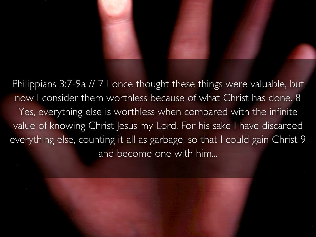 Philippians 3:7-9a // 7 I once thought these things were valuable, but now I consider them worthless because of what Christ has done. 8 Yes, everything else is worthless when compared with the infinite value of knowing Christ Jesus my Lord. For his sake I have discarded everything else, counting it all as garbage, so that I could gain Christ 9 and become one with him...