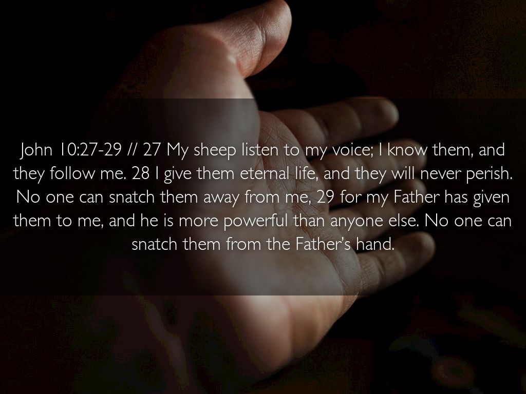 John 10:27-29 // 27 My sheep listen to my voice; I know them, and they follow me. 28 I give them eternal life, and they will never perish. No one can snatch them away from me, 29 for my Father has given them to me, and he is more powerful than anyone else. No one can snatch them from the Father’s hand.