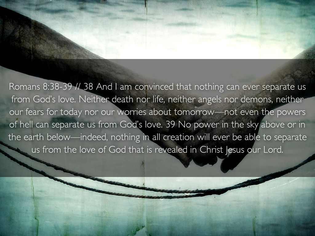 Romans 8:38-39 // 38 And I am convinced that nothing can ever separate us from God’s love. Neither death nor life, neither angels nor demons, neither our fears for today nor our worries about tomorrow—not even the powers of hell can separate us from God’s love. 39 No power in the sky above or in the earth below—indeed, nothing in all creation will ever be able to separate us from the love of God that is revealed in Christ Jesus our Lord.