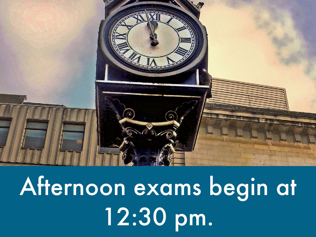 Be outside your exam room (south foyer for cafeteria/gymnasium) by 12:15 pm to allow time for finding seats, listening to invigilator's instructions and previewing the exam.