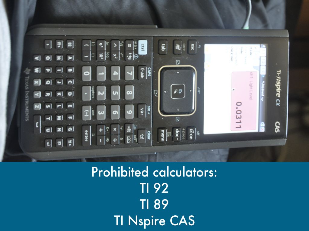 Also prohibited: -TI Voyage 200 (all versions) -TI Nspire (non-CAS) version 1.1, 1.2 or any version not updated to the latest OS.