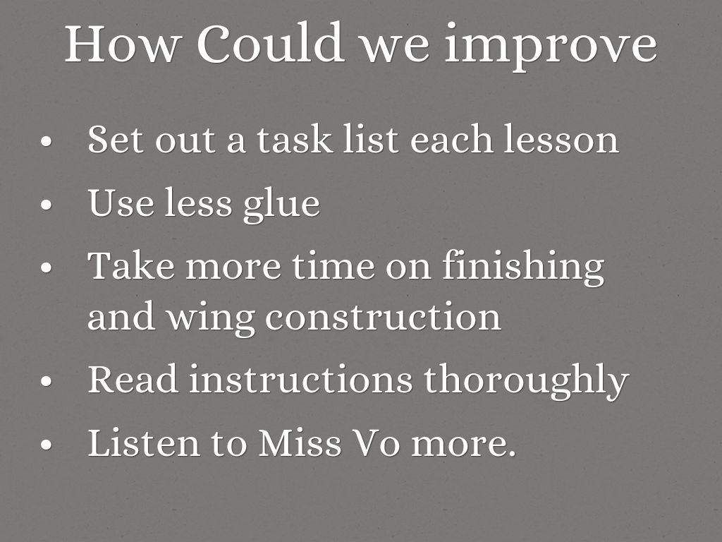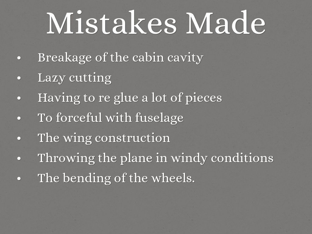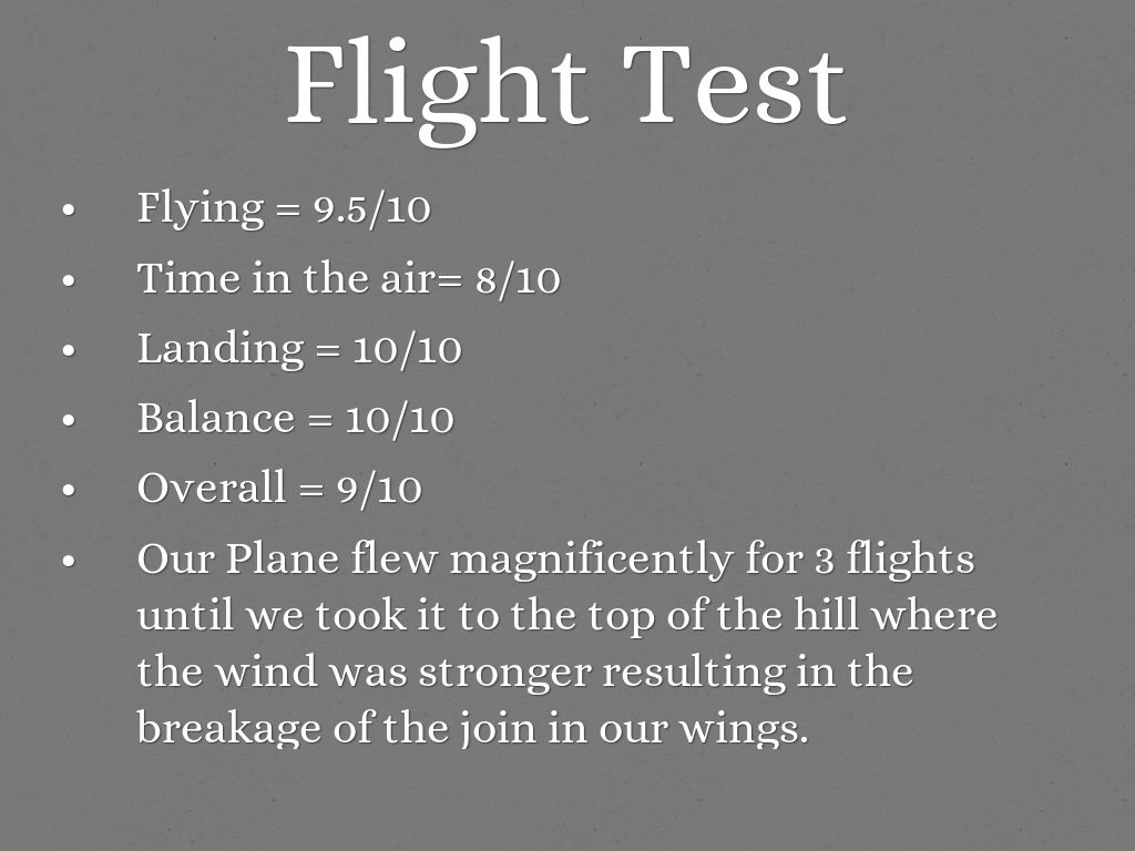 - Our Plane flew magnificently for 3 flights until we took it to the top of the hill where the wind was stronger resulting in the breakage of the join in our wings.