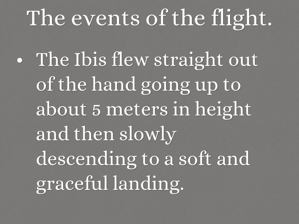 - The Ibis flew straight out of the hand going up to about 5 meters in height and then slowly descending to a soft and graceful landing.