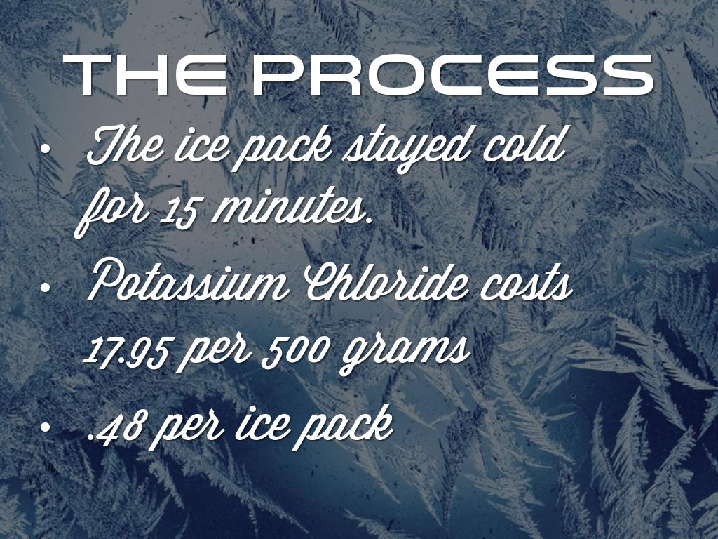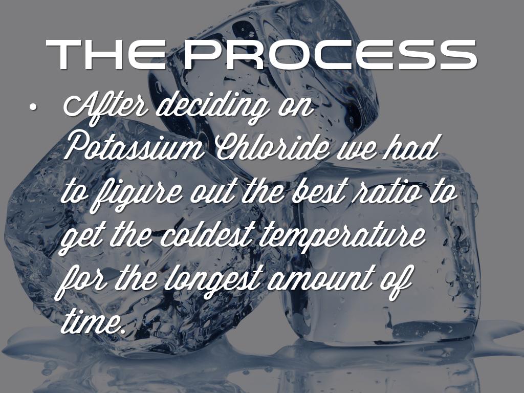 After deciding on Potassium Chloride we had to figure out the best ratio to get the coldest temperature for the longest amount of time.