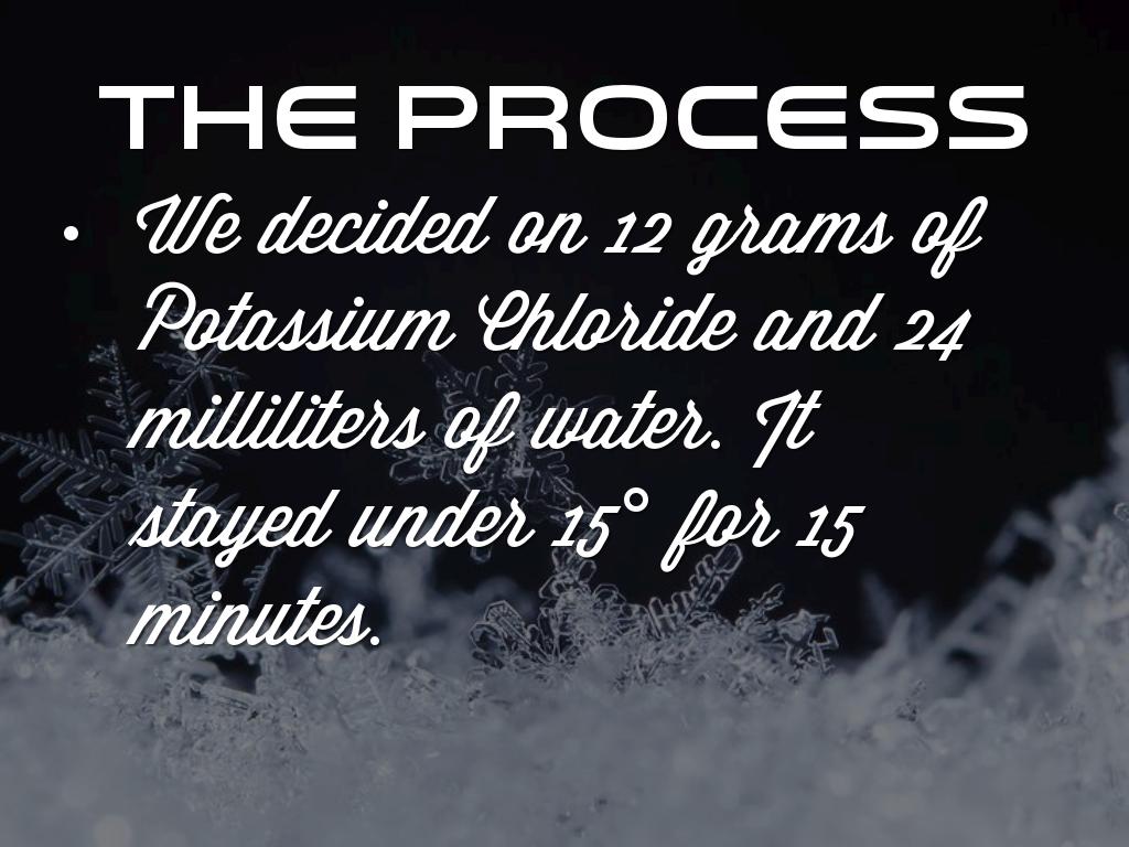 We decided on 12 grams of Potassium Chloride and 24 milliliters of water. It stayed under 15° for 15 minutes.