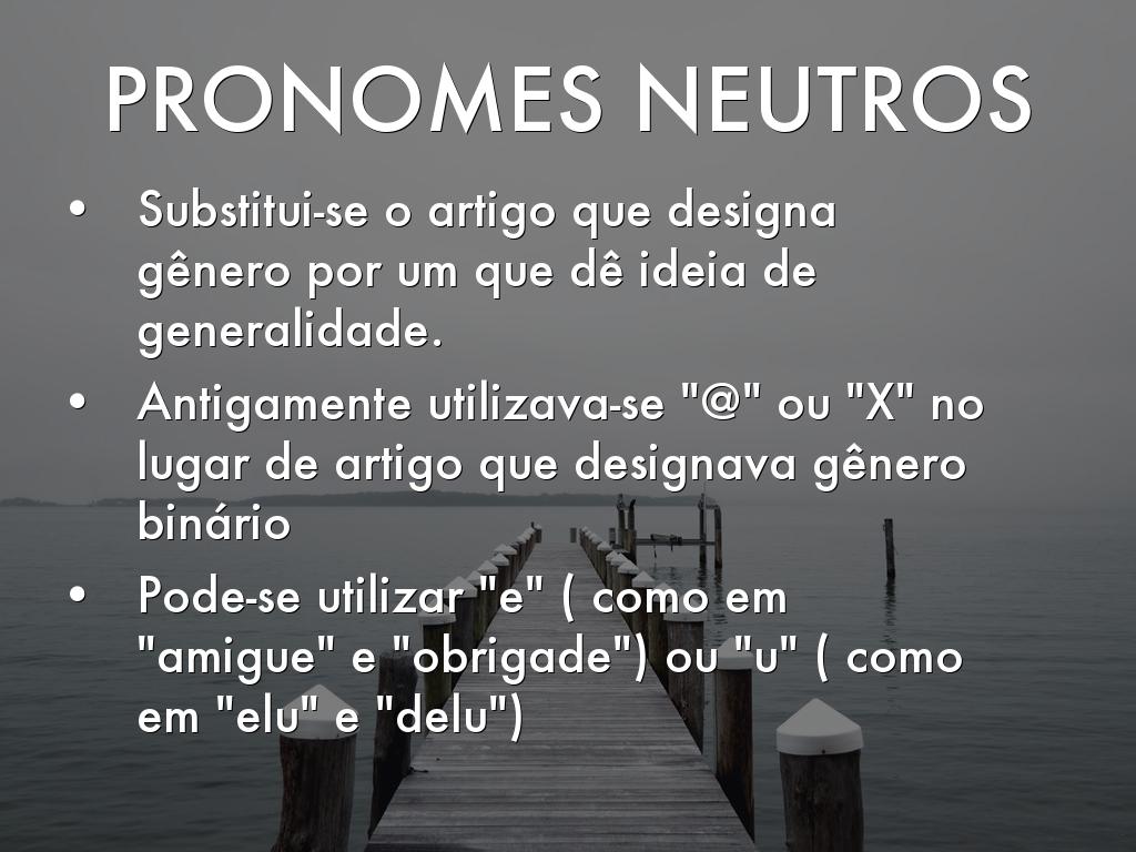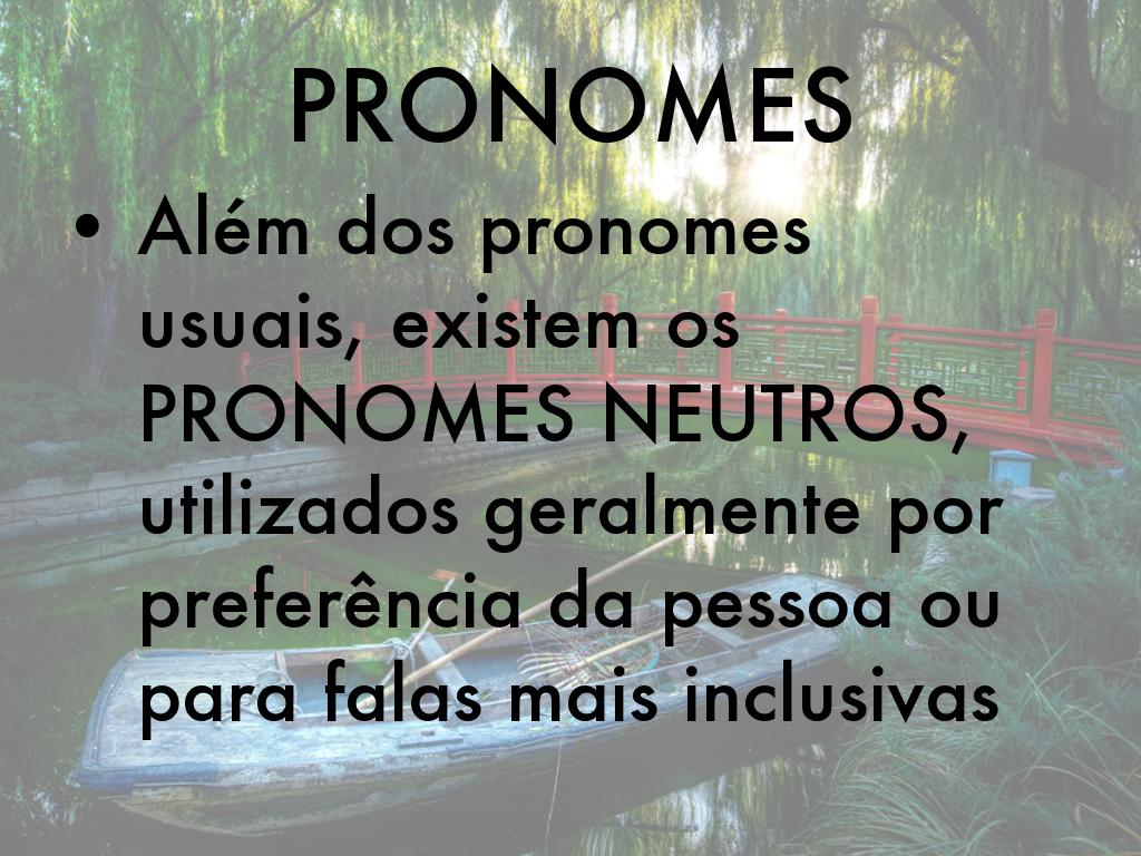Além dos pronomes usuais, existem os PRONOMES NEUTROS, utilizados geralmente por preferência da pessoa ou para falas mais inclusivas