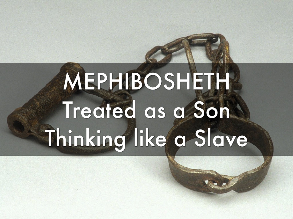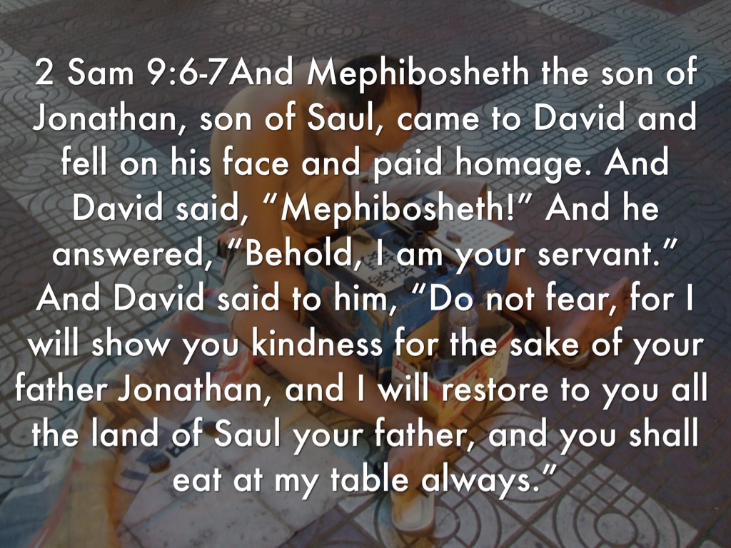 2 Sam 9:6-7And Mephibosheth the son of Jonathan, son of Saul, came to David and fell on his face and paid homage. And David said, “Mephibosheth!” And he answered, “Behold, I am your servant.” And David said to him, “Do not fear, for I will show you kindness for the sake of your father Jonathan, and I will restore to you all the land of Saul your father, and you shall eat at my table always.”