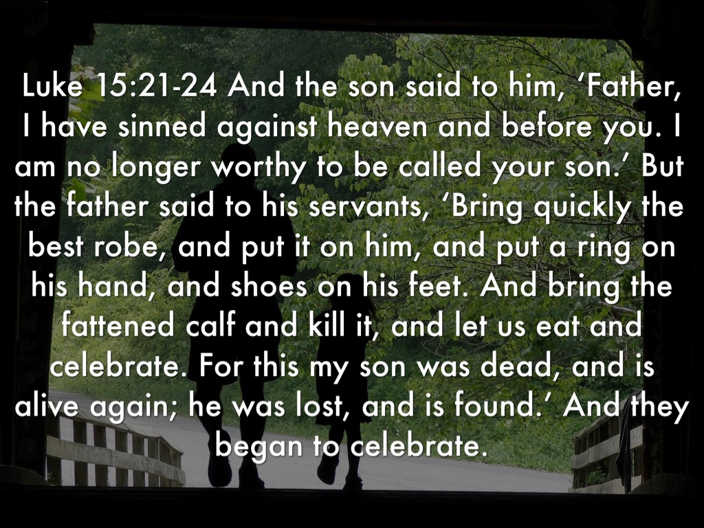 Luke 15:21-24 And the son said to him, ‘Father, I have sinned against heaven and before you. I am no longer worthy to be called your son.’ But the father said to his servants, ‘Bring quickly the best robe, and put it on him, and put a ring on his hand, and shoes on his feet. And bring the fattened calf and kill it, and let us eat and celebrate. For this my son was dead, and is alive again; he was lost, and is found.’ And they began to celebrate.