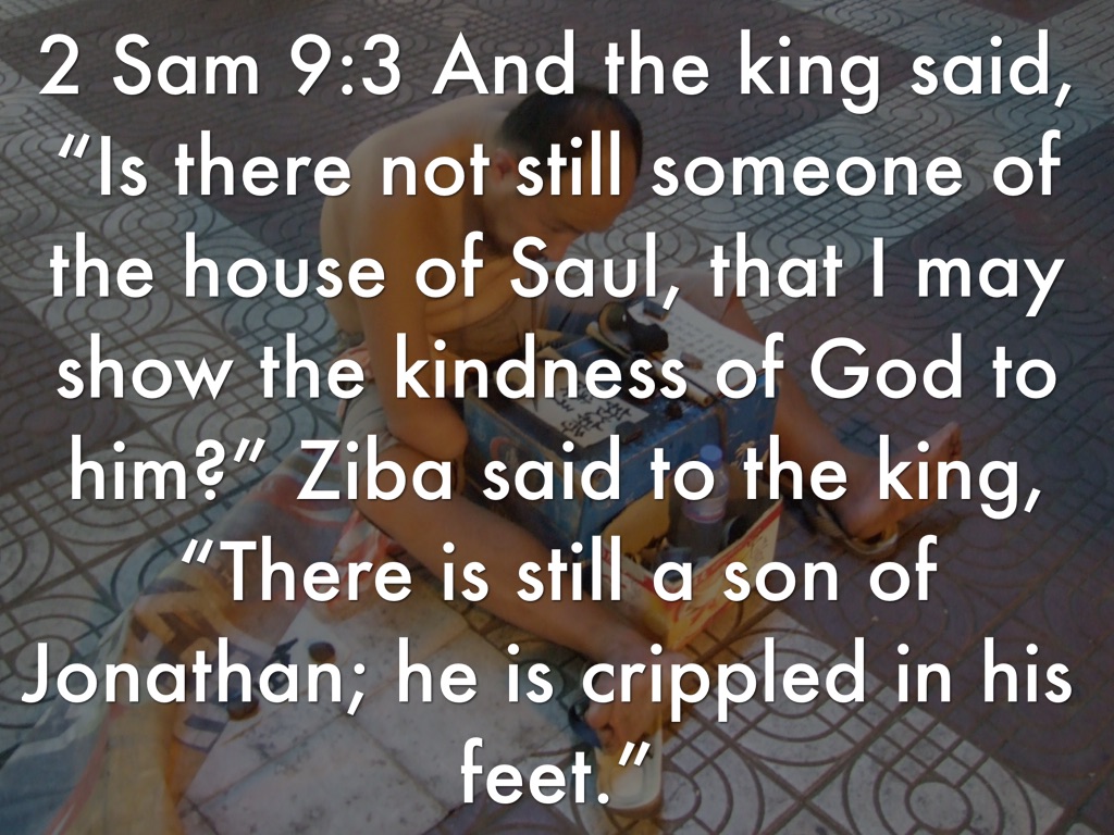 2 Sam 9:3 And the king said, “Is there not still someone of the house of Saul, that I may show the kindness of God to him?” Ziba said to the king, “There is still a son of Jonathan; he is crippled in his feet.”