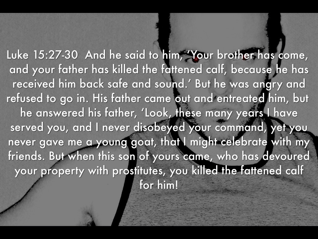 Luke 15:27-30 And he said to him, ‘Your brother has come, and your father has killed the fattened calf, because he has received him back safe and sound.’ But he was angry and refused to go in. His father came out and entreated him, but he answered his father, ‘Look, these many years I have served you, and I never disobeyed your command, yet you never gave me a young goat, that I might celebrate with my friends. But when this son of yours came, who has devoured your property with prostitutes, you killed the fattened calf for him!
