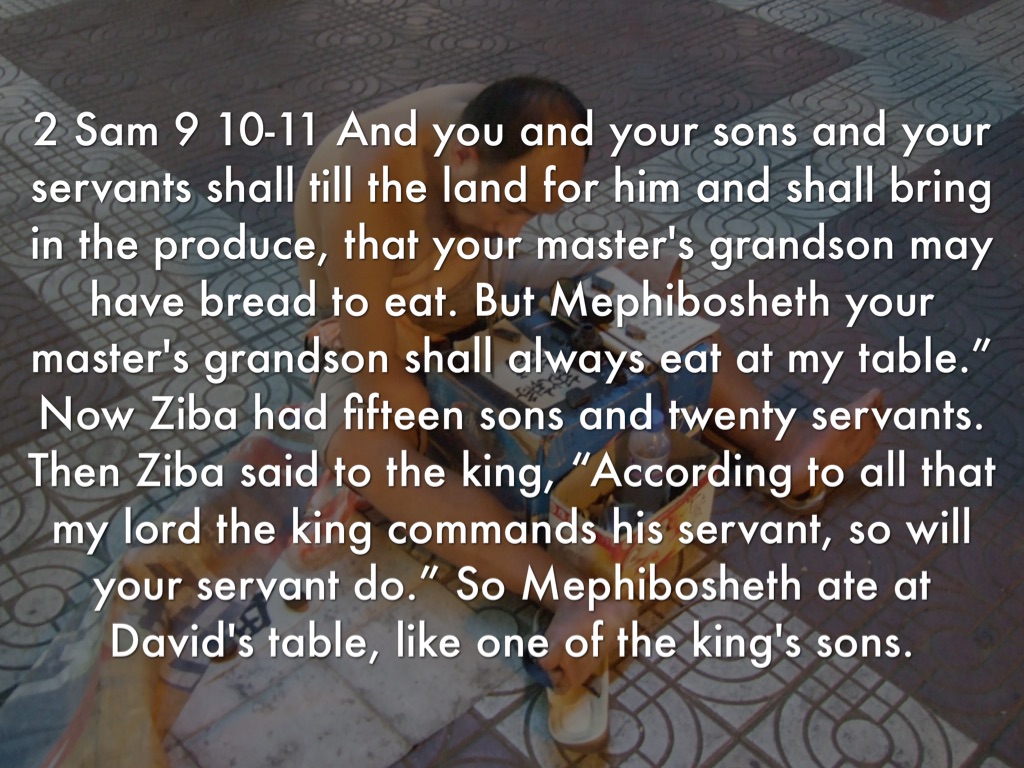 2 Sam 9 10-11 And you and your sons and your servants shall till the land for him and shall bring in the produce, that your master's grandson may have bread to eat. But Mephibosheth your master's grandson shall always eat at my table.” Now Ziba had fifteen sons and twenty servants. Then Ziba said to the king, “According to all that my lord the king commands his servant, so will your servant do.” So Mephibosheth ate at David's table, like one of the king's sons.