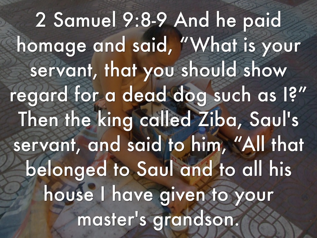 2 Samuel 9:8-9 And he paid homage and said, “What is your servant, that you should show regard for a dead dog such as I?” Then the king called Ziba, Saul's servant, and said to him, “All that belonged to Saul and to all his house I have given to your master's grandson.