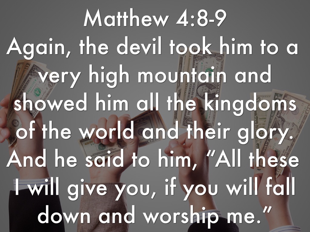 Matthew 4:8-9 Again, the devil took him to a very high mountain and showed him all the kingdoms of the world and their glory. And he said to him, “All these I will give you, if you will fall down and worship me.”