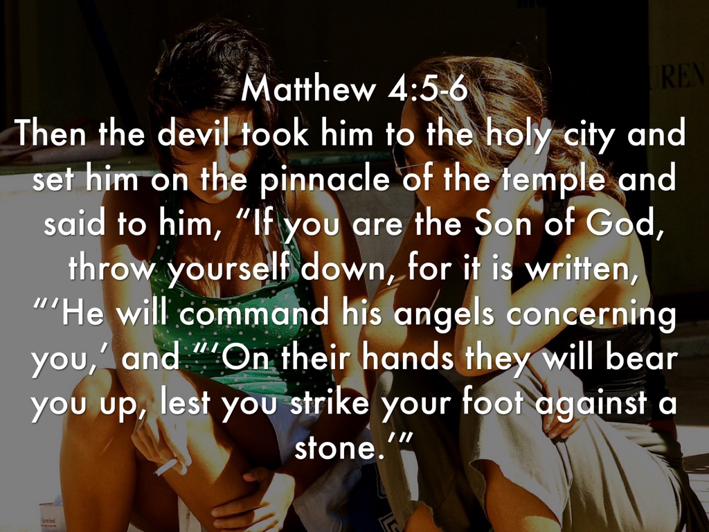 Matthew 4:5-6 Then the devil took him to the holy city and set him on the pinnacle of the temple and said to him, “If you are the Son of God, throw yourself down, for it is written, “‘He will command his angels concerning you,’ and “‘On their hands they will bear you up, lest you strike your foot against a stone.’”