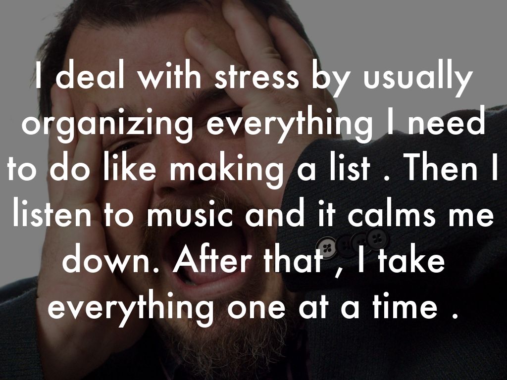 I deal with stress by usually organizing everything I need to do like making a list . Then I listen to music and it calms me down. After that , I take everything one at a time .