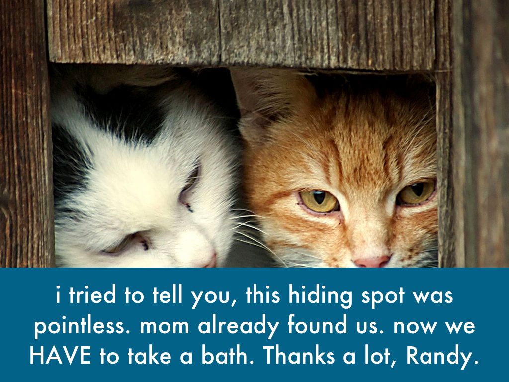 i tried to tell you, this hiding spot was pointless. mom already found us. now we HAVE to take a bath. Thanks a lot, Randy.