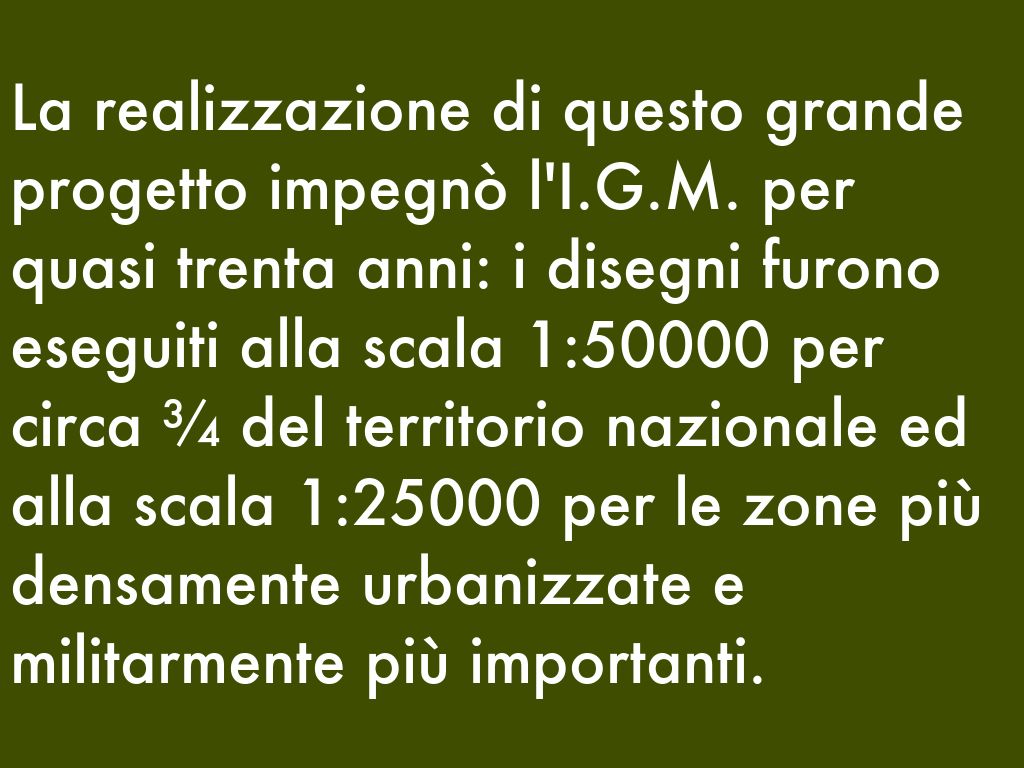 La realizzazione di questo grande progetto impegnò l'I.G.M. per quasi trenta anni: i disegni furono eseguiti alla scala 1:50000 per circa ¾ del territorio nazionale ed alla scala 1:25000 per le zone più densamente urbanizzate e militarmente più importanti.