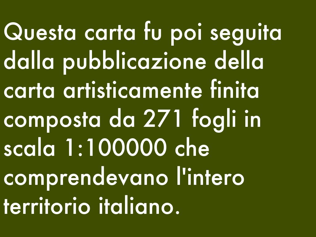 Questa carta fu poi seguita dalla pubblicazione della carta artisticamente finita composta da 271 fogli in scala 1:100000 che comprendevano l'intero territorio italiano.