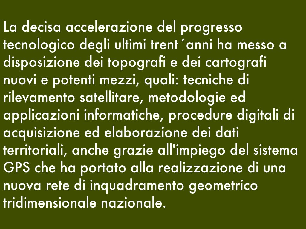 La decisa accelerazione del progresso tecnologico degli ultimi trent´anni ha messo a disposizione dei topografi e dei cartografi nuovi e potenti mezzi, quali: tecniche di rilevamento satellitare, metodologie ed applicazioni informatiche, procedure digitali di acquisizione ed elaborazione dei dati territoriali, anche grazie all'impiego del sistema GPS che ha portato alla realizzazione di una nuova rete di inquadramento geometrico tridimensionale nazionale.