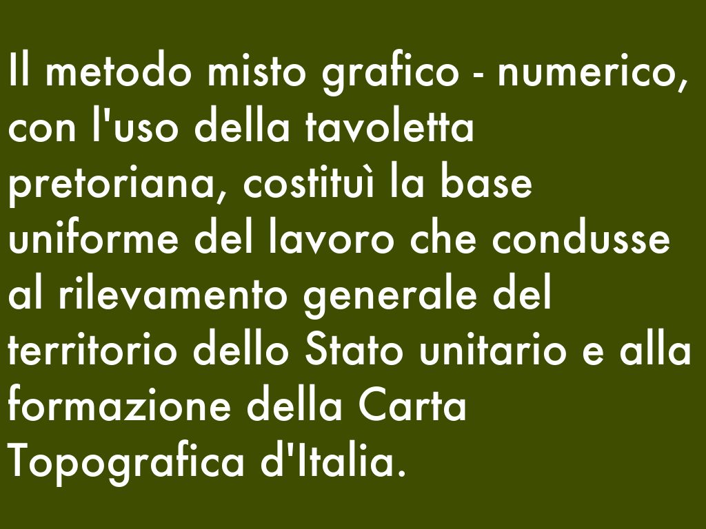 Il metodo misto grafico - numerico, con l'uso della tavoletta pretoriana, costituì la base uniforme del lavoro che condusse al rilevamento generale del territorio dello Stato unitario e alla formazione della Carta Topografica d'Italia.