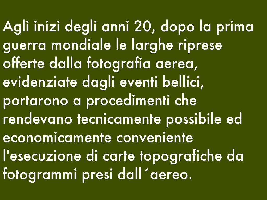 Agli inizi degli anni 20, dopo la prima guerra mondiale le larghe riprese offerte dalla fotografia aerea, evidenziate dagli eventi bellici, portarono a procedimenti che rendevano tecnicamente possibile ed economicamente conveniente l'esecuzione di carte topografiche da fotogrammi presi dall´aereo.