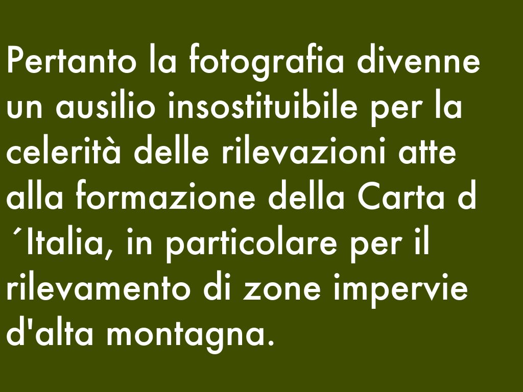 Pertanto la fotografia divenne un ausilio insostituibile per la celerità delle rilevazioni atte alla formazione della Carta d´Italia, in particolare per il rilevamento di zone impervie d'alta montagna.