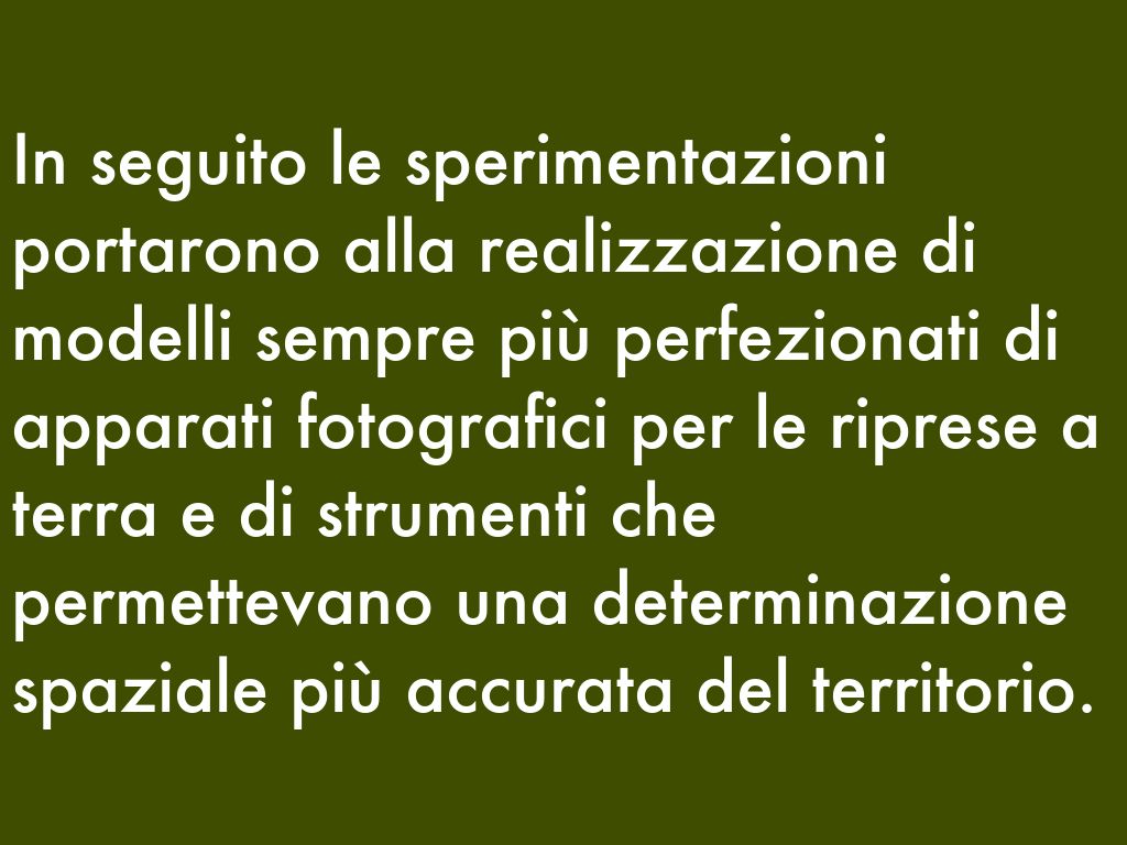 In seguito le sperimentazioni portarono alla realizzazione di modelli sempre più perfezionati di apparati fotografici per le riprese a terra e di strumenti che permettevano una determinazione spaziale più accurata del territorio.