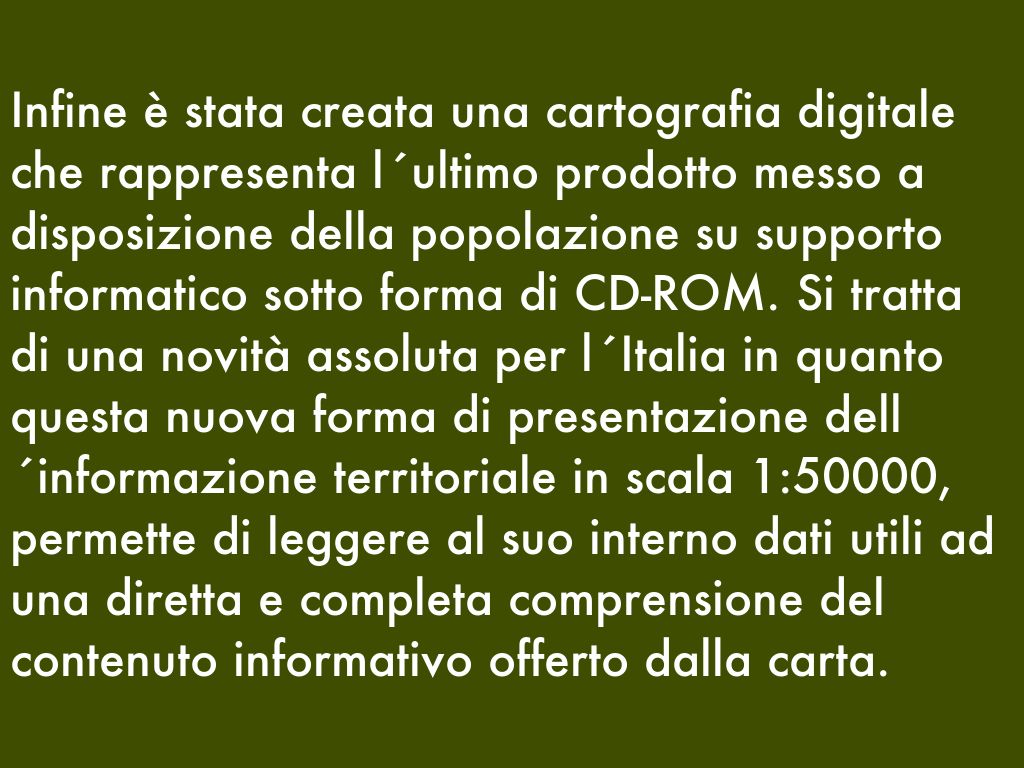 Infine è stata creata una cartografia digitale che rappresenta l´ultimo prodotto messo a disposizione della popolazione su supporto informatico sotto forma di CD-ROM. Si tratta di una novità assoluta per l´Italia in quanto questa nuova forma di presentazione dell´informazione territoriale in scala 1:50000, permette di leggere al suo interno dati utili ad una diretta e completa comprensione del contenuto informativo offerto dalla carta.