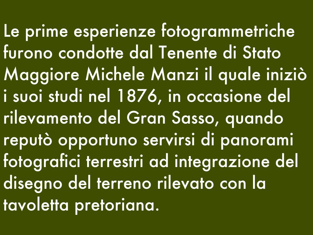 Le prime esperienze fotogrammetriche furono condotte dal Tenente di Stato Maggiore Michele Manzi il quale iniziò i suoi studi nel 1876, in occasione del rilevamento del Gran Sasso, quando reputò opportuno servirsi di panorami fotografici terrestri ad integrazione del disegno del terreno rilevato con la tavoletta pretoriana.