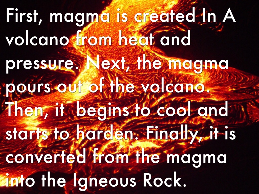 First, magma is created In A volcano from heat and pressure. Next, the magma pours out of the volcano. Then, it begins to cool and starts to harden. Finally, it is converted from the magma into the Igneous Rock.