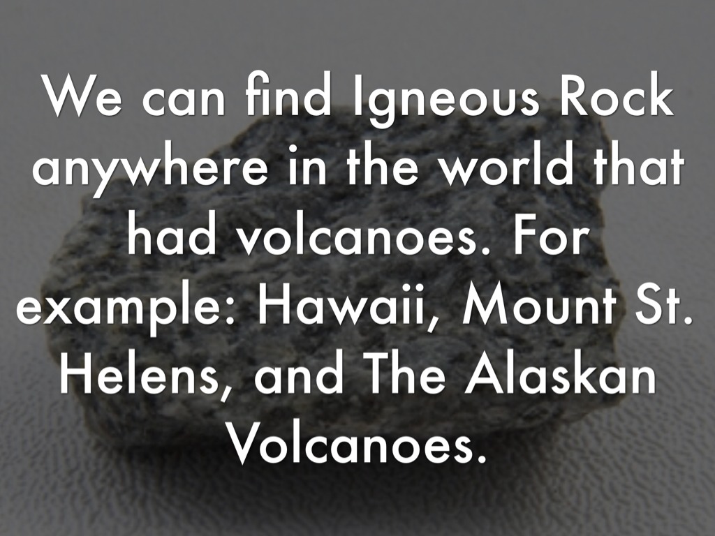 We can find Igneous Rock anywhere in the world that had volcanoes. For example: Hawaii, Mount St. Helens, and The Alaskan Volcanoes.