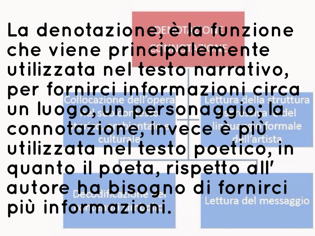 La denotazione, è la funzione che viene principalemente utilizzata nel testo narrativo, per fornirci informazioni circa un luogo, un personaggio; la connotazione, invece è più utilizzata nel testo poetico, in quanto il poeta, rispetto all' autore ha bisogno di fornirci più informazioni.