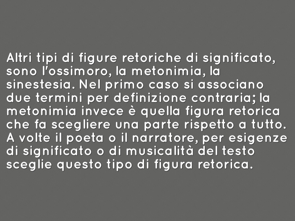 Altri tipi di figure retoriche di significato, sono l'ossimoro, la metonimia, la sinestesia. Nel primo caso si associano due termini per definizione contraria; la metonimia invece è quella figura retorica che fa scegliere una parte rispetto a tutto. A volte il poeta o il narratore, per esigenze di significato o di musicalità del testo sceglie questo tipo di figura retorica.