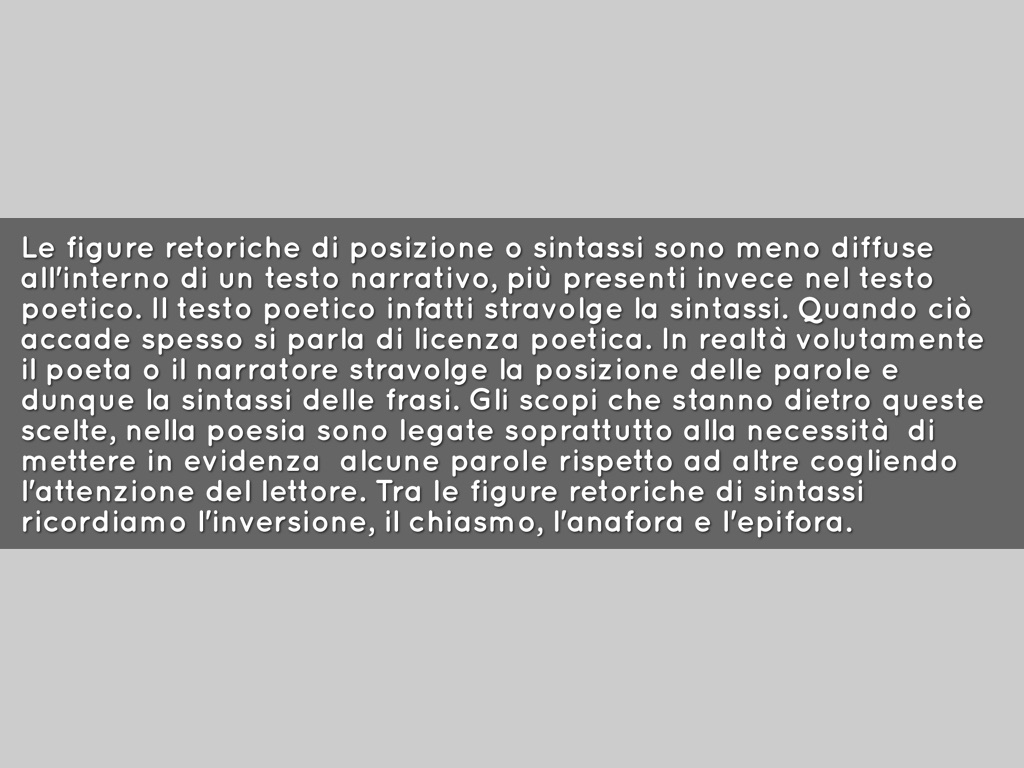 Le figure retoriche di posizione o sintassi sono meno diffuse all'interno di un testo narrativo, più presenti invece nel testo poetico. Il testo poetico infatti stravolge la sintassi. Quando ciò accade spesso si parla di licenza poetica. In realtà volutamente il poeta o il narratore stravolge la posizione delle parole e dunque la sintassi delle frasi. Gli scopi che stanno dietro queste scelte, nella poesia sono legate soprattutto alla necessità di mettere in evidenza alcune parole rispetto ad altre cogliendo l'attenzione del lettore. Tra le figure retoriche di sintassi ricordiamo l'inversione, il chiasmo, l'anafora e l'epifora.
