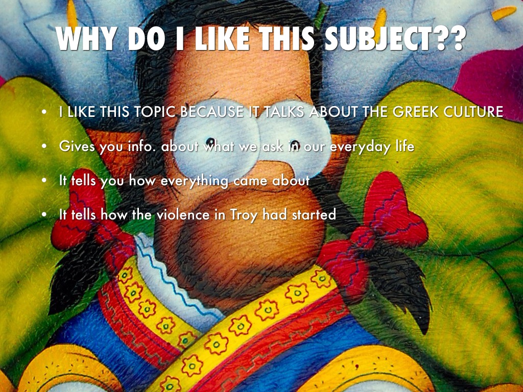 WHY SHOULD YOU LIKE THIS SUBJECT IN THIS UNIT??? The Iliad has so much more to it. This subject has be going on for years. Pasted on to generation to generation and it would never die out.You should like and recommend this part to anyone that can read because it has love, loyalty, hatred, confusion, backstabbing, drama, happy endings, bad endings, and also a lot of details. That's why I picked this particular part out of my whole textbook.