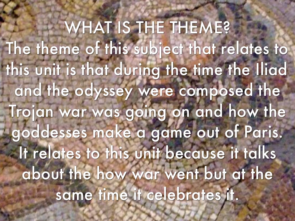 WHAT IS THE THEME? The theme of this subject that relates to this unit is that during the time the Iliad and the odyssey were composed the Trojan war was going on and how the goddesses make a game out of Paris. It relates to this unit because it talks about the how war went but at the same time it celebrates it.