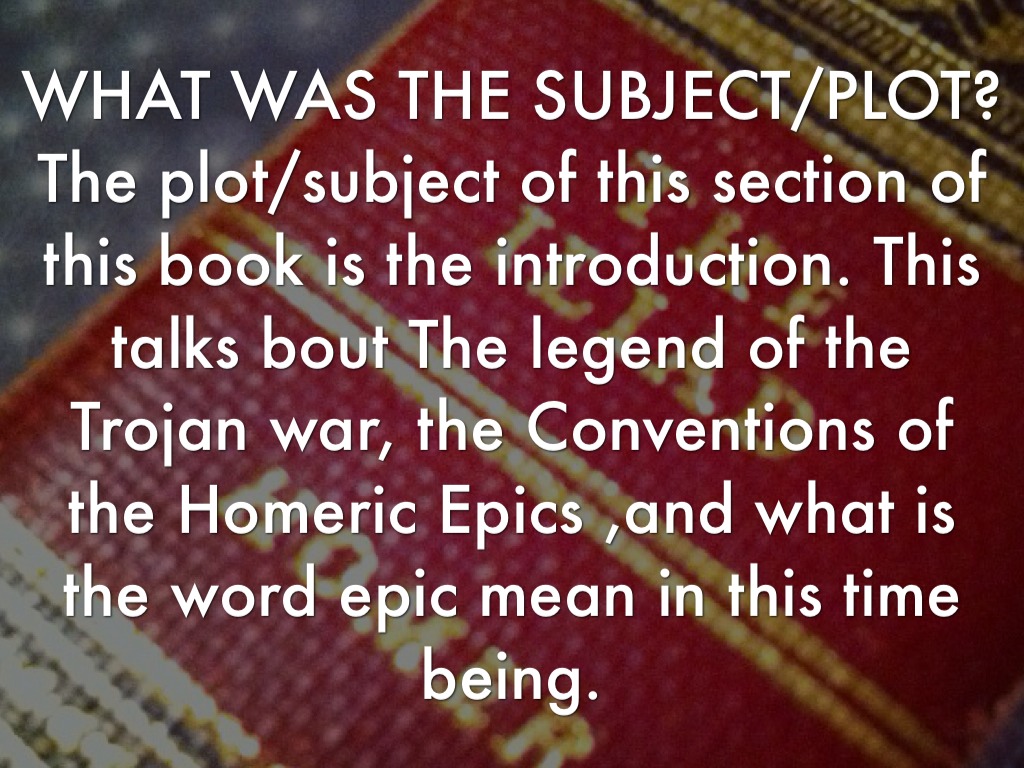 WHAT WAS THE SUBJECT/PLOT? The plot/subject of this section of this book is the introduction. This talks bout The legend of the Trojan war, the Conventions of the Homeric Epics ,and what is the word epic mean in this time being.
