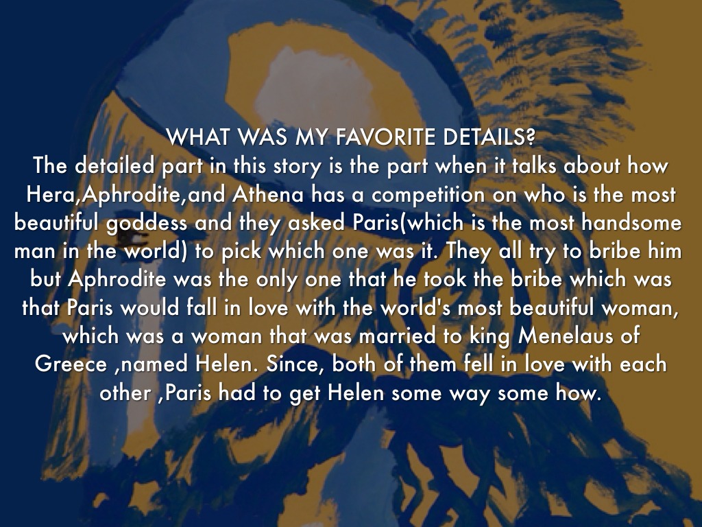 WHAT WAS MY FAVORITE DETAILS? The detailed part in this story is the part when it talks about how Hera,Aphrodite,and Athena has a competition on who is the most beautiful goddess and they asked Paris(which is the most handsome man in the world) to pick which one was it. They all try to bribe him but Aphrodite was the only one that he took the bribe which was that Paris would fall in love with the world's most beautiful woman, which was a woman that was married to king Menelaus of Greece ,named Helen. Since, both of them fell in love with each other ,Paris had to get Helen some way some how.