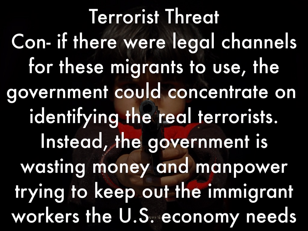 Terrorist Threat Con- if there were legal channels for these migrants to use, the government could concentrate on identifying the real terrorists. Instead, the government is wasting money and manpower trying to keep out the immigrant workers the U.S. economy needs
