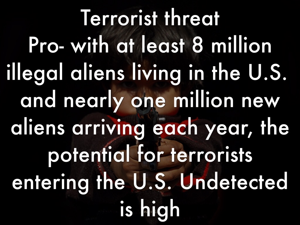 Terrorist threat Pro- with at least 8 million illegal aliens living in the U.S. and nearly one million new aliens arriving each year, the potential for terrorists entering the U.S. Undetected is high