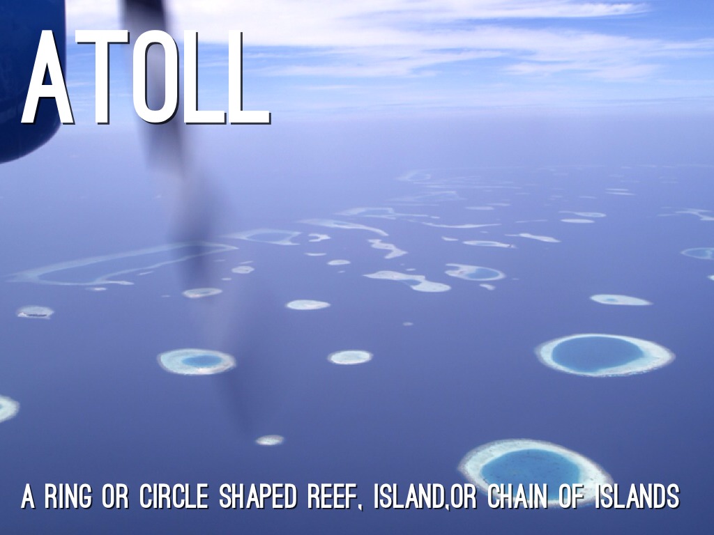 A RING OR CIRCLE SHAPED REEF, ISLAND,OR CHAIN OF ISLANDS