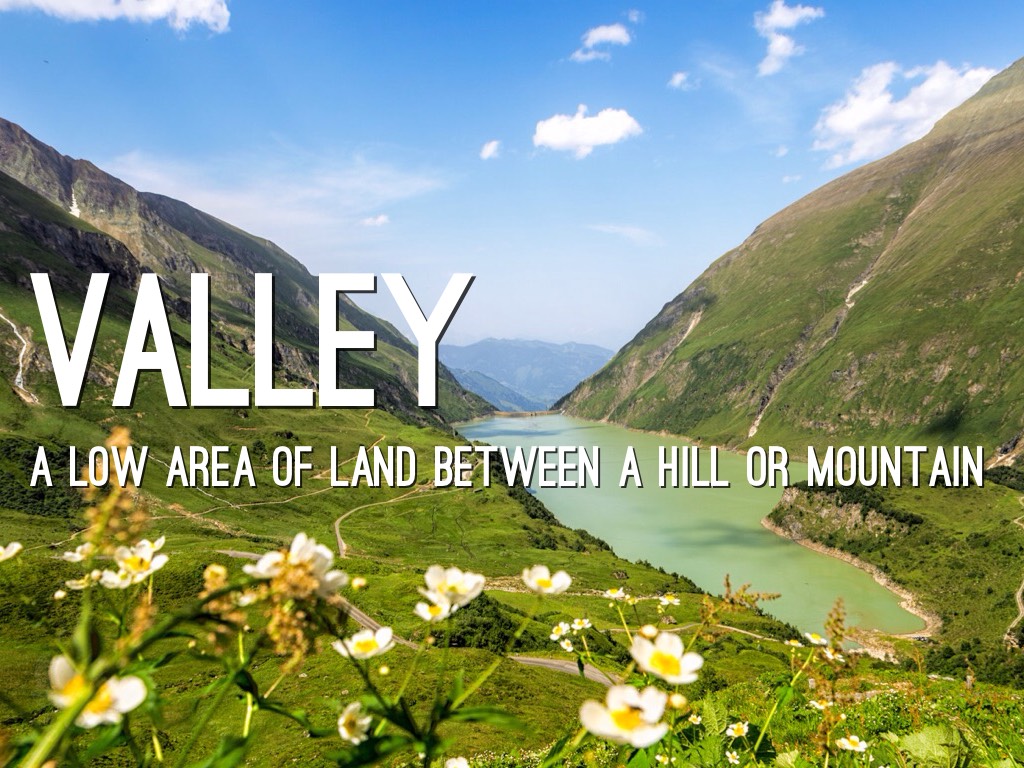 A LOW AREA OF LAND BETWEEN A HILL OR MOUNTAIN