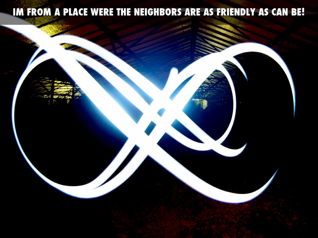 IM FROM A PLACE WERE THE NEIGHBORS ARE AS FRIENDLY AS CAN BE!