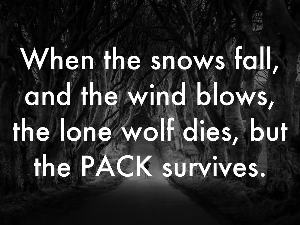 When the snows fall, and the wind blows, the lone wolf dies, but the PACK survives.