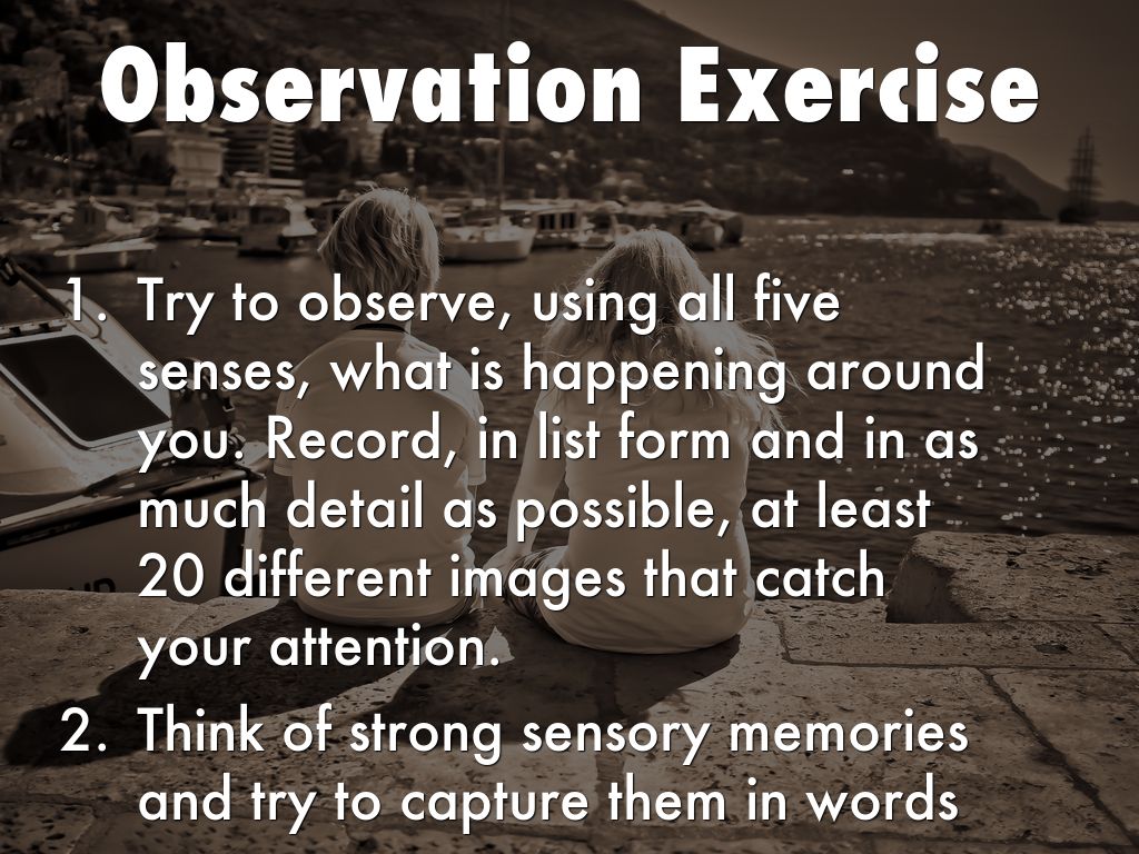 To take imagery deeper, and explore its potential for catalyzing new poems, you could expand upon the observation exercise above. For example, try taking one image from your observation and writing a page about it, not limiting yourself to what you see and hear and smell directly anymore, but allowing the sensory input to spark other thoughts, memories, images, story, and emotional weight.