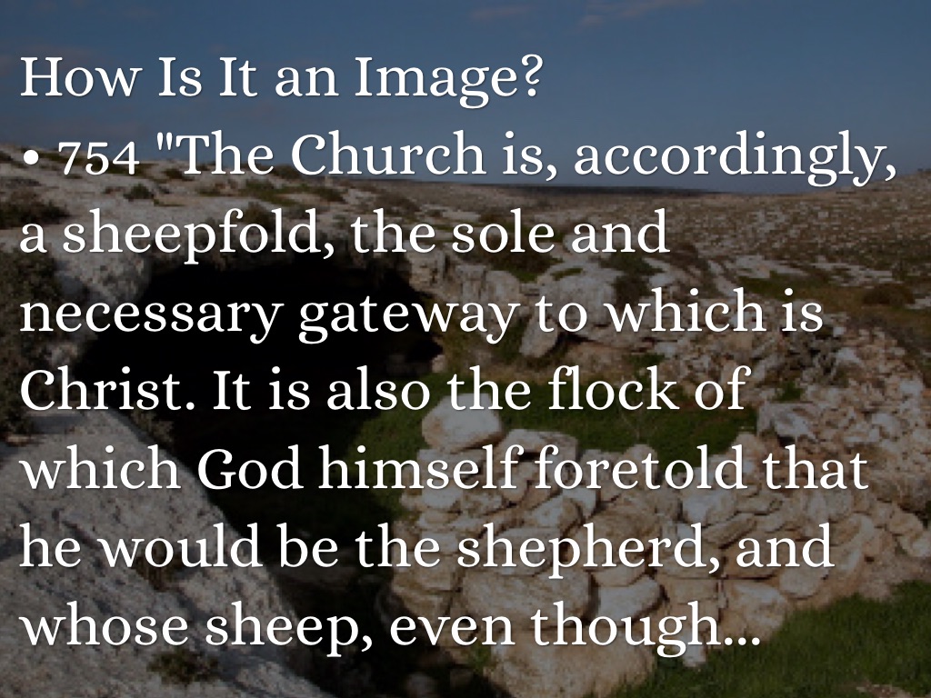 • 754 "The Church is, accordingly, a sheepfold, the sole and necessary gateway to which is Christ. It is also the flock of which God himself foretold that he would be the shepherd, and whose sheep, even though...