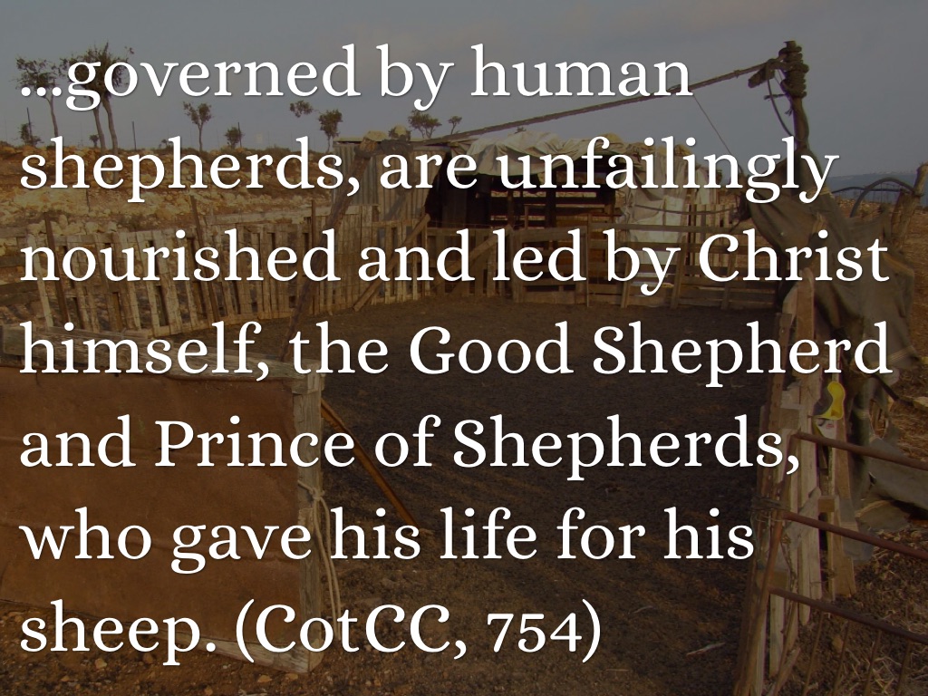 ...governed by human shepherds, are unfailingly nourished and led by Christ himself, the Good Shepherd and Prince of Shepherds, who gave his life for his sheep. (CotCC, 754)