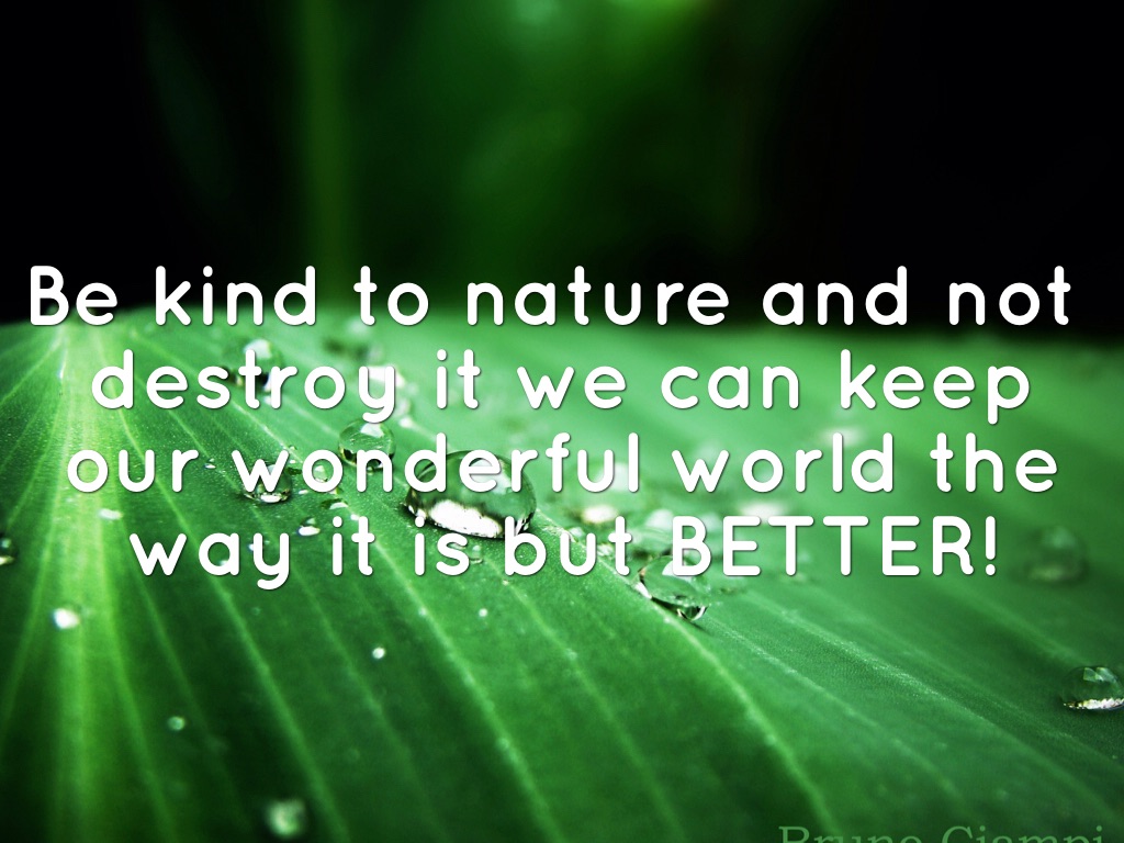 Be kind to nature and not destroy it we can keep our wonderful world the way it is but BETTER!