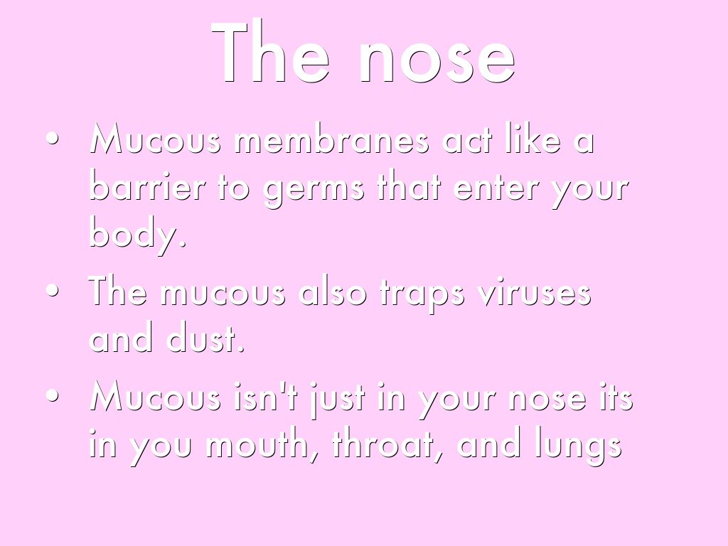 - Mucous isn't just in your nose its in you mouth, throat, and lungs