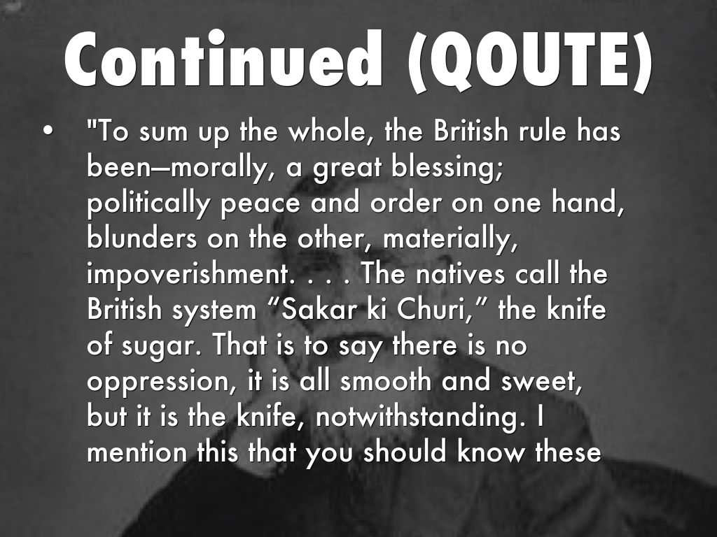 "To sum up the whole, the British rule has been—morally, a great blessing; politically peace and order on one hand, blunders on the other, materially, impoverishment. . . . The natives call the British system “Sakar ki Churi,” the knife of sugar. That is to say there is no oppression, it is all smooth and sweet, but it is the knife, notwithstanding. I mention this that you should know these feelings. Our great misfortune is that you do not know our wants. When you will know our real wishes,